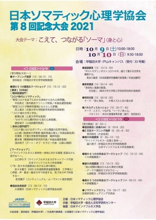 毎年秋頃に行われる、日本ソマティック心理学協会の大会。第8回となる今回の記念大会は、早稲田大学・戸山キャンパスにて、10月9日(土)、10日(日)の2日間にわたって開催され、こころとからだの生き生きとしたつながりについて、様々な講演、ワークショップ、交流の場が繰り広げられます。
